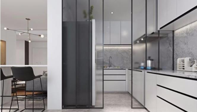 厨房的设计,是用玻璃联动推拉门把中厨和西厨隔开,因为是现代风格,所以橱柜选用了白色墨尔本样式