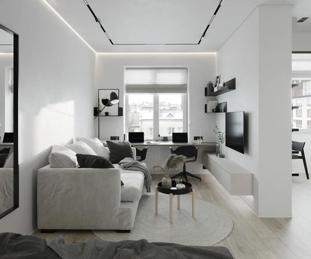 简洁与功能性同时满足是设计师在打造这间小户型的主要愿望,纯白是空间的底色,不同深浅的灰色让空间在刻板中增添些许质感。
