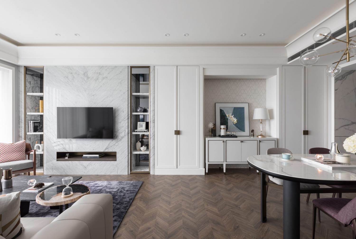 白色系客厅点缀大理石的与木地板的纹理,在平凡中带点变化;电视主墙的两侧开放层柜以及门片柜收纳,则诠释十大美感中的对称美学