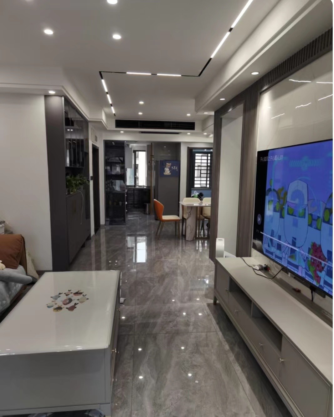 客厅做的无主灯设计,轨道灯,背景墙是一个条格加岩板的造型