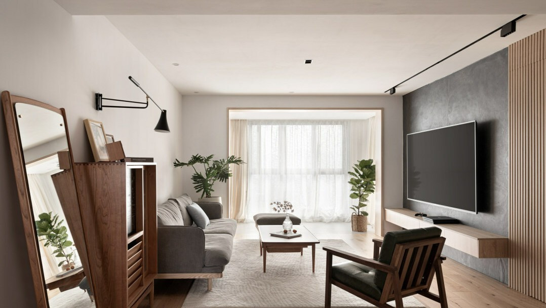 电视组合柜的方正与沙发墙的石膏线组成的方格,在设计形体上达到呼应,也给了空间的变化的层次带来节奏感。