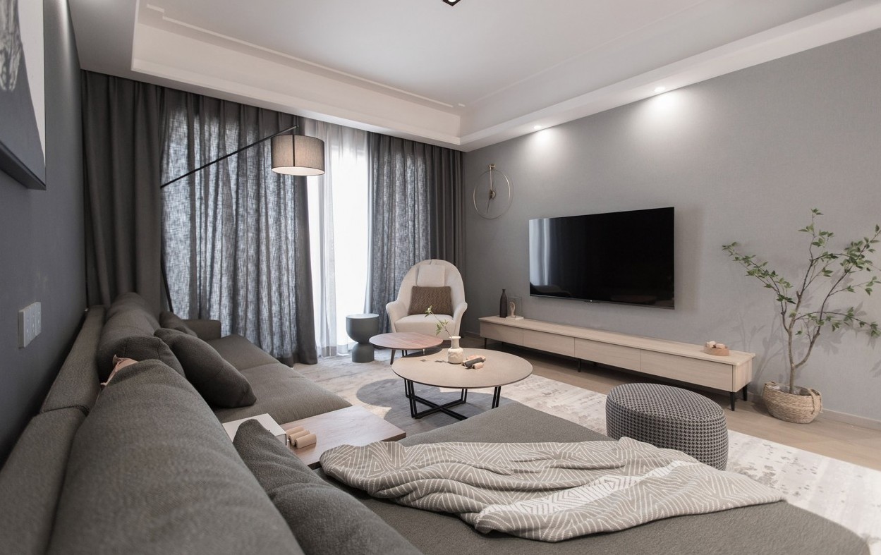 将摩登气质刻入整体基调 从面到体,阐述纯色之美 使跳色与细纹 唤活了客厅的生活仪式感