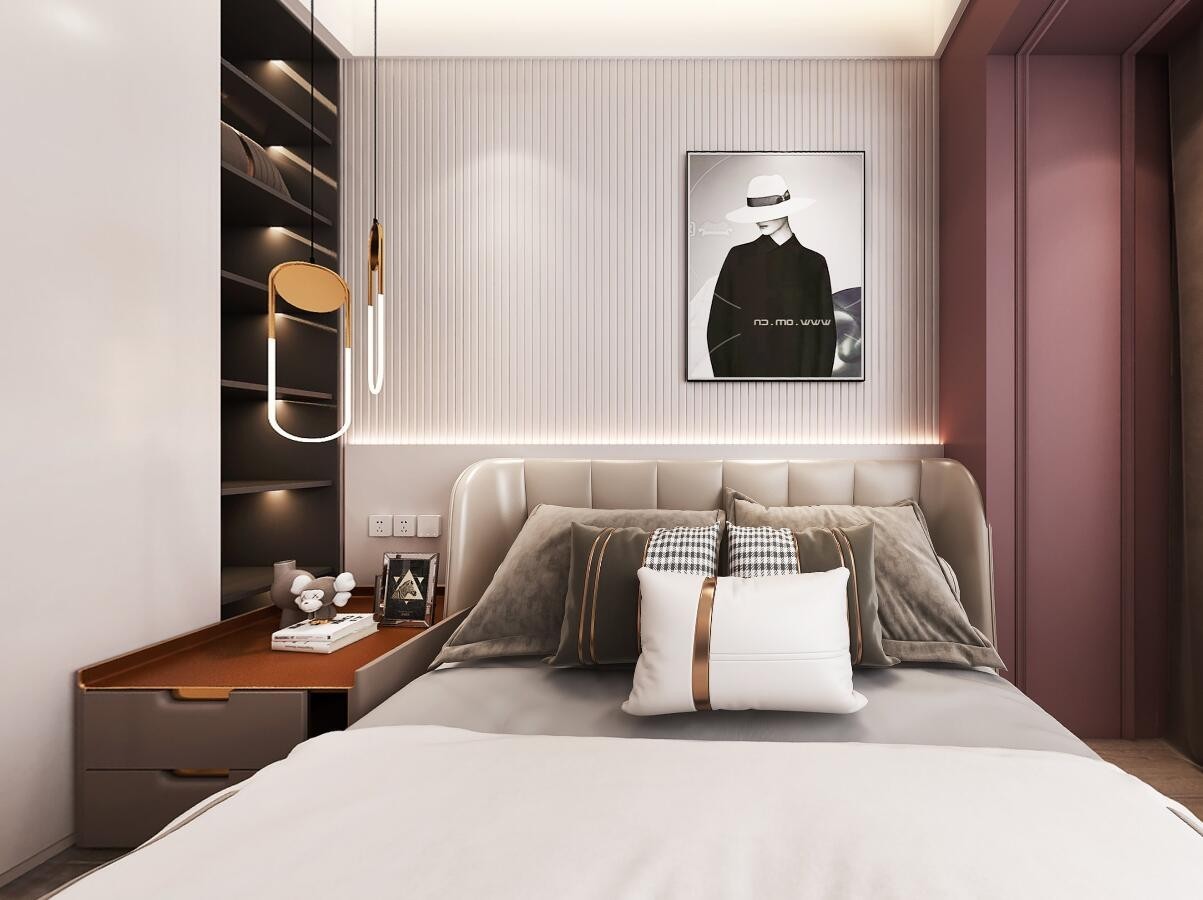 主卧的布置温馨精致,床头的格栅板搭配着少许的玫红色,让空间瞬间就亮了起来,床头一侧的吊灯,为室内营造舒适的休息氛围感。