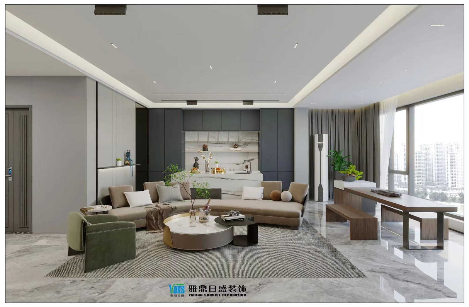 客厅设计上将阳台与客厅的空间相连,设计成一个大的空厅空间。整个空间采用低饱和度莫兰迪色系,为整个空间带来轻奢感,客厅的沙发与阳台的木制桌椅,不同材质形成碰撞,将气质凸显。