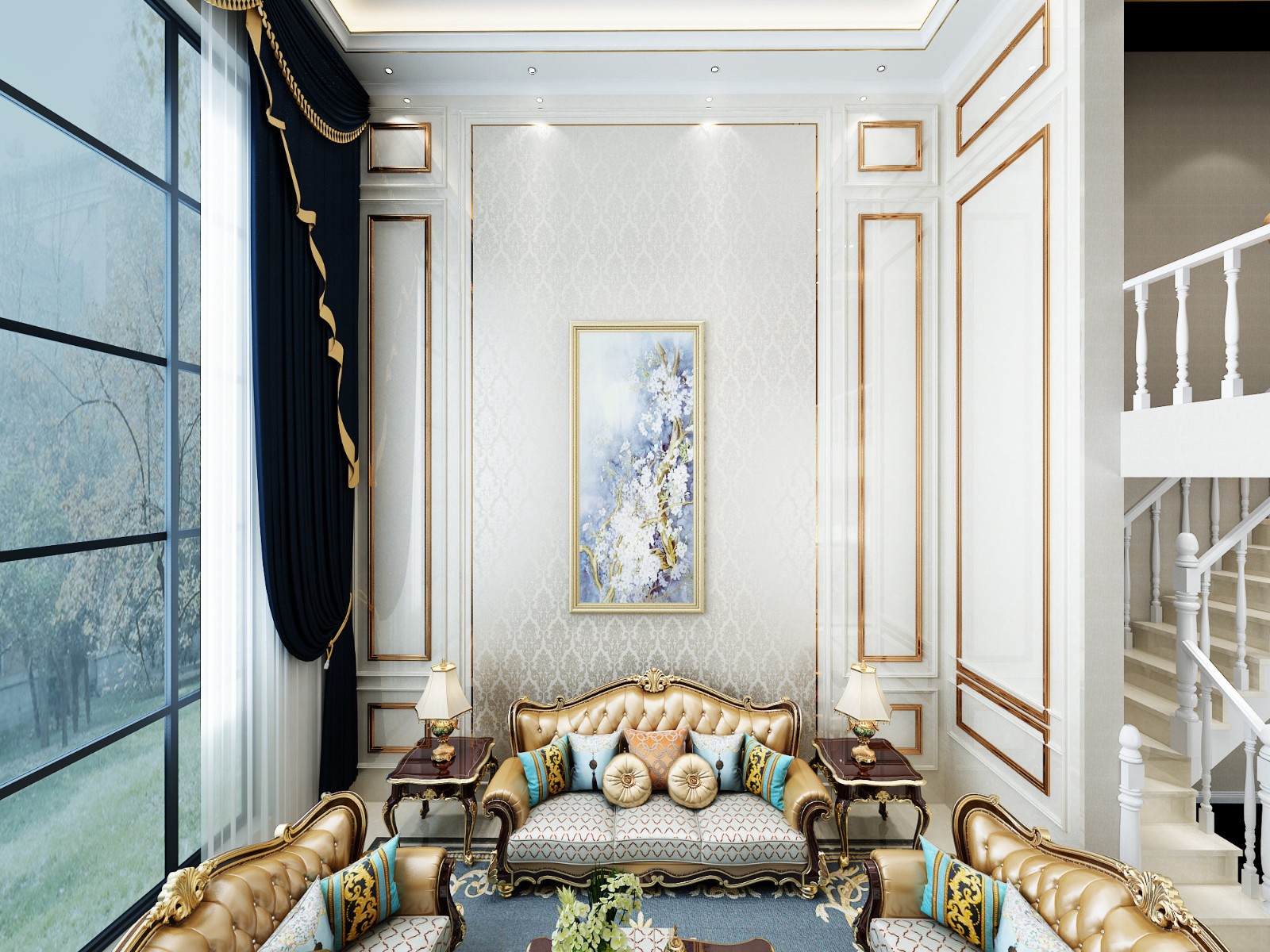 整个客厅的层高非常高,以白色为主的墙面搭配上金属质感的线条,美观又大气