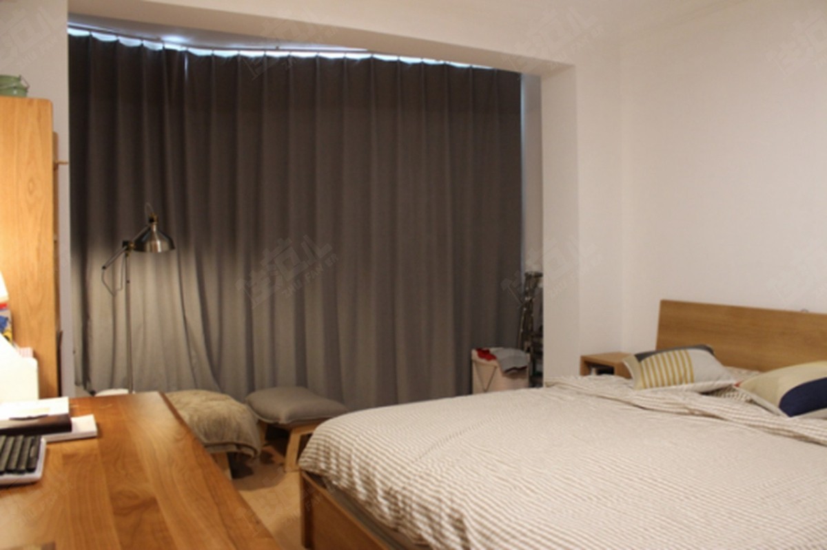 把客厅的空间完全利用后,卧室承担了休息、工作、阅读、更衣储物的四打功能。