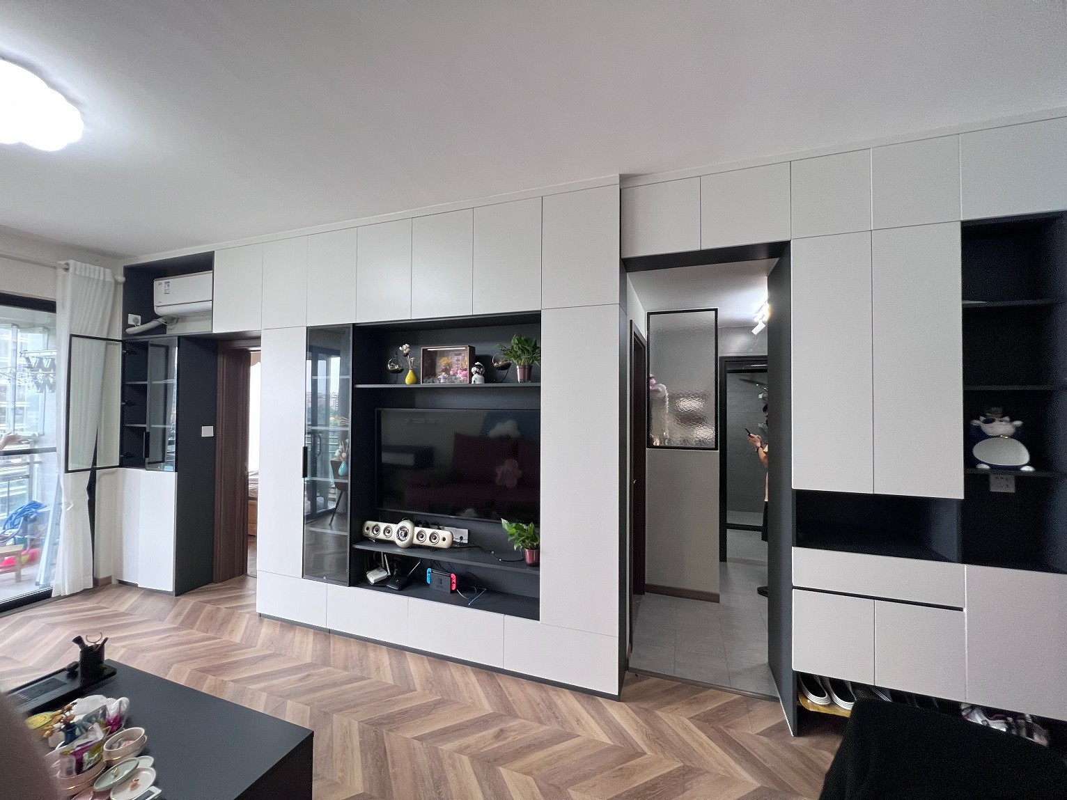客厅选择用定制柜来做电视背景墙,从玄关一路延伸到阳台区域。