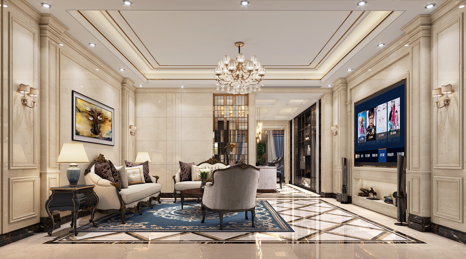 欧式客厅总能给人绚丽奢华的感觉,暖色的家具,华丽的吊灯,搭配着精致的石膏线与罗马柱,华丽而不浮夸,营造出温馨的浪漫气氛,彰显主人非凡的品味。