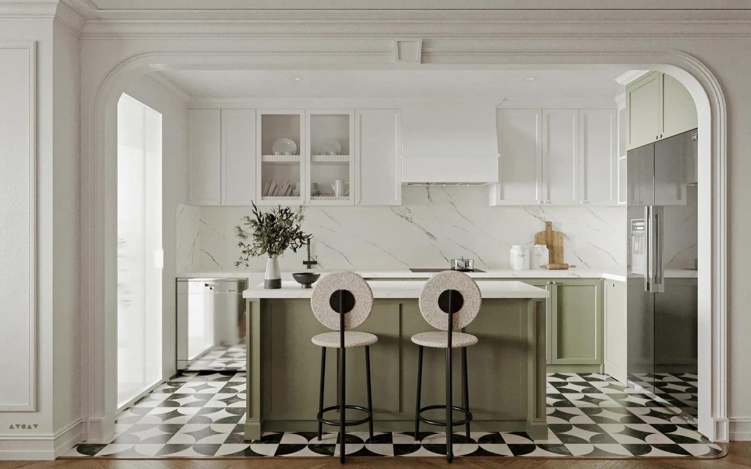 本案用了绿色为主色调,做了一些静美的法式装饰。既有复古优雅又实用简洁。