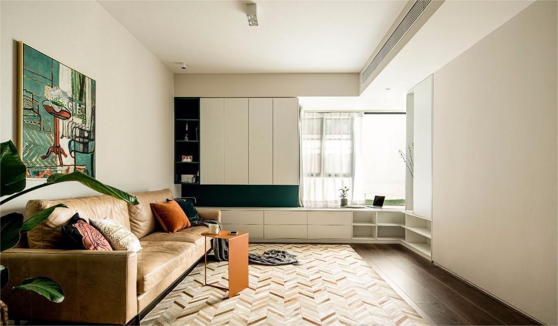 考虑进门玄关直通客厅并没有做隔断柜,直接就能看见阳台这面墙,半墙刷了高雅的墨绿色搭配白色储物柜和开放展示格做端景柜,结合半边窗外的风景营造一幅动静合一的优美画面,给人入门眼前一亮的感觉。