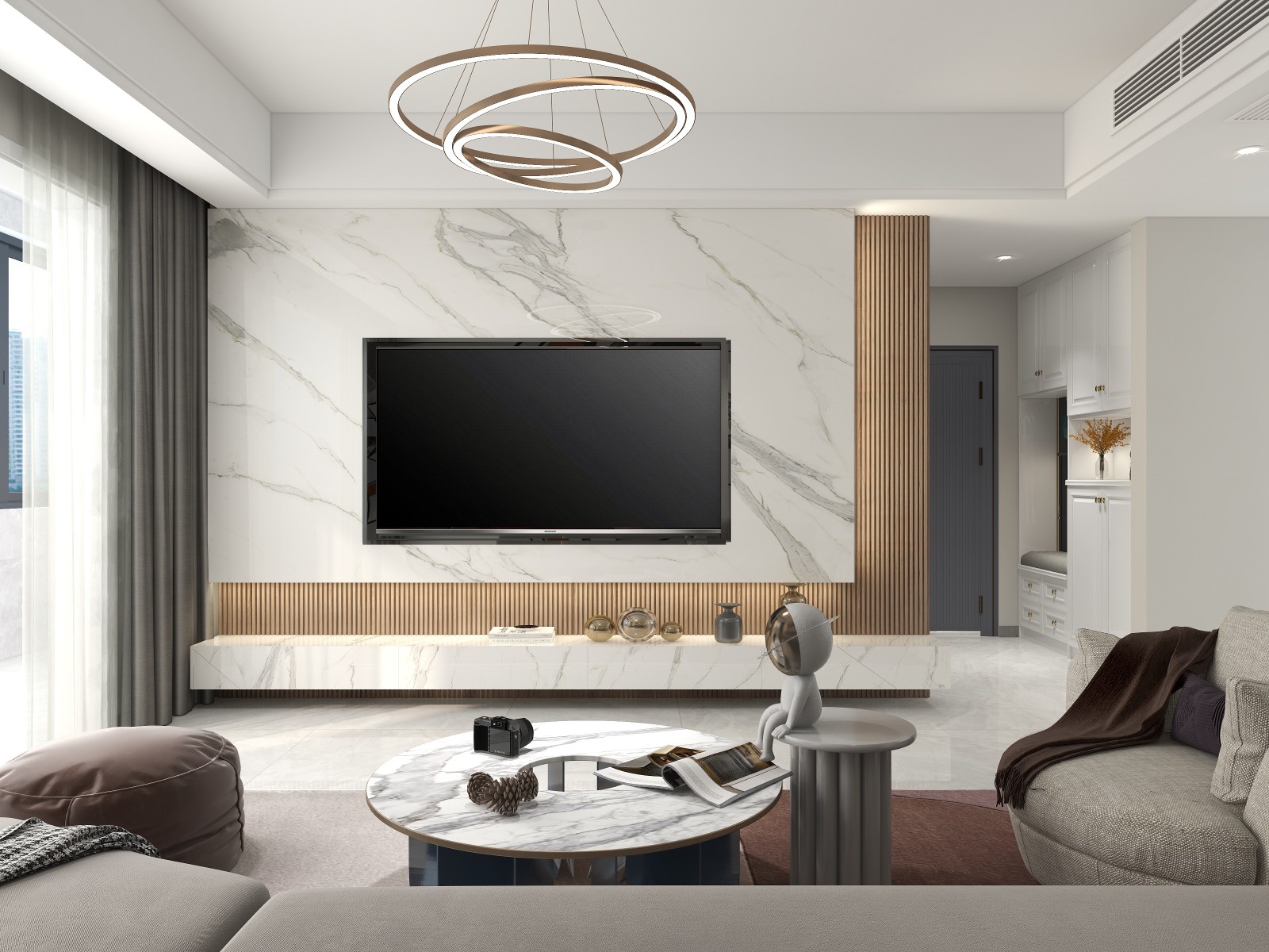 电视背景墙用格栅,墙面挂大理石,设计了悬浮电视柜,好清洁