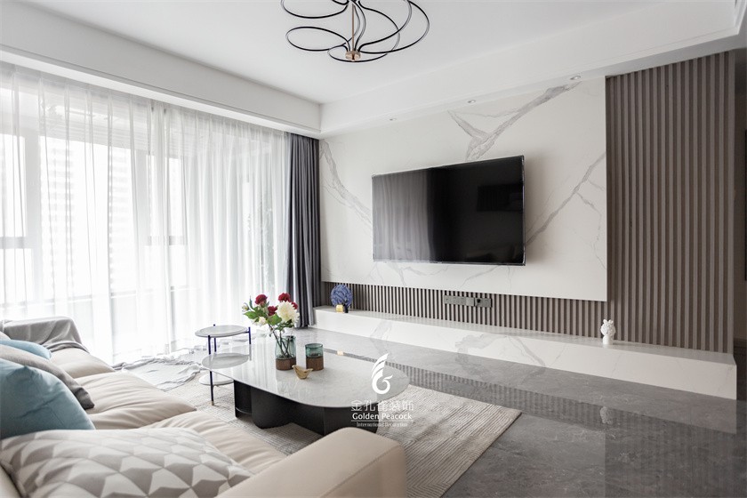 电视背景墙采用大理石材质作为主材,结合温润栅格木板进行装饰,电视柜则是同色系大理石地台式的设计,以材质的碰撞出“美”的样性。