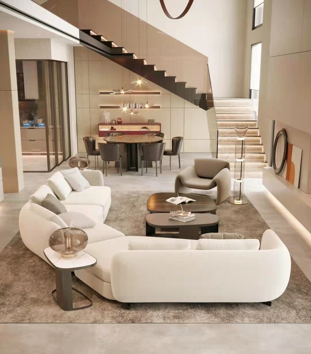 能为了保持空间的整洁,设计师在客厅,餐厅,厨房区域定制大量柜体,咖木色与浅灰色混搭、精确的柜体分割模数,显得空间规整,极具高雅,品质感。