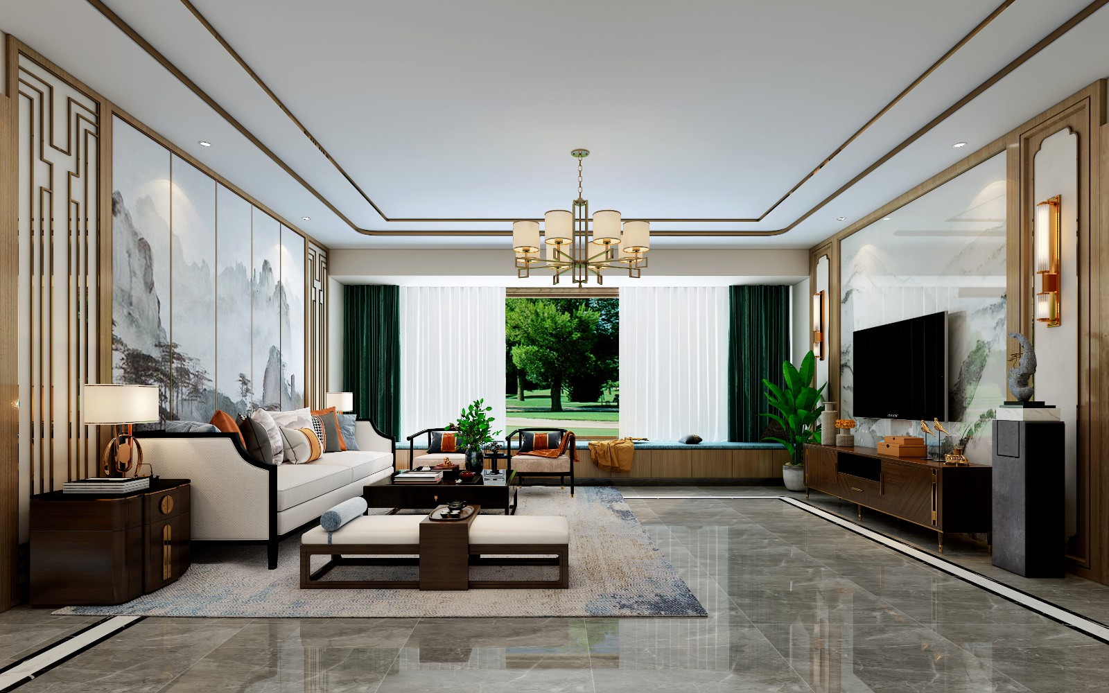 中式的背景墙与现代风的软装融合,使整个空间相互衬托