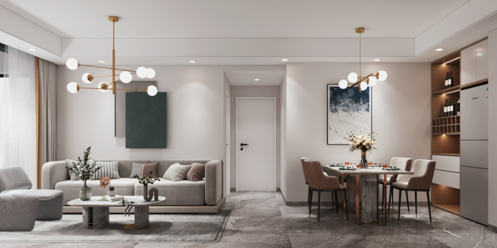一体化客餐厅***的优点是能够充分利用空间,减少压抑感与拥挤感,打通视野,获得更好的获得视觉效果你