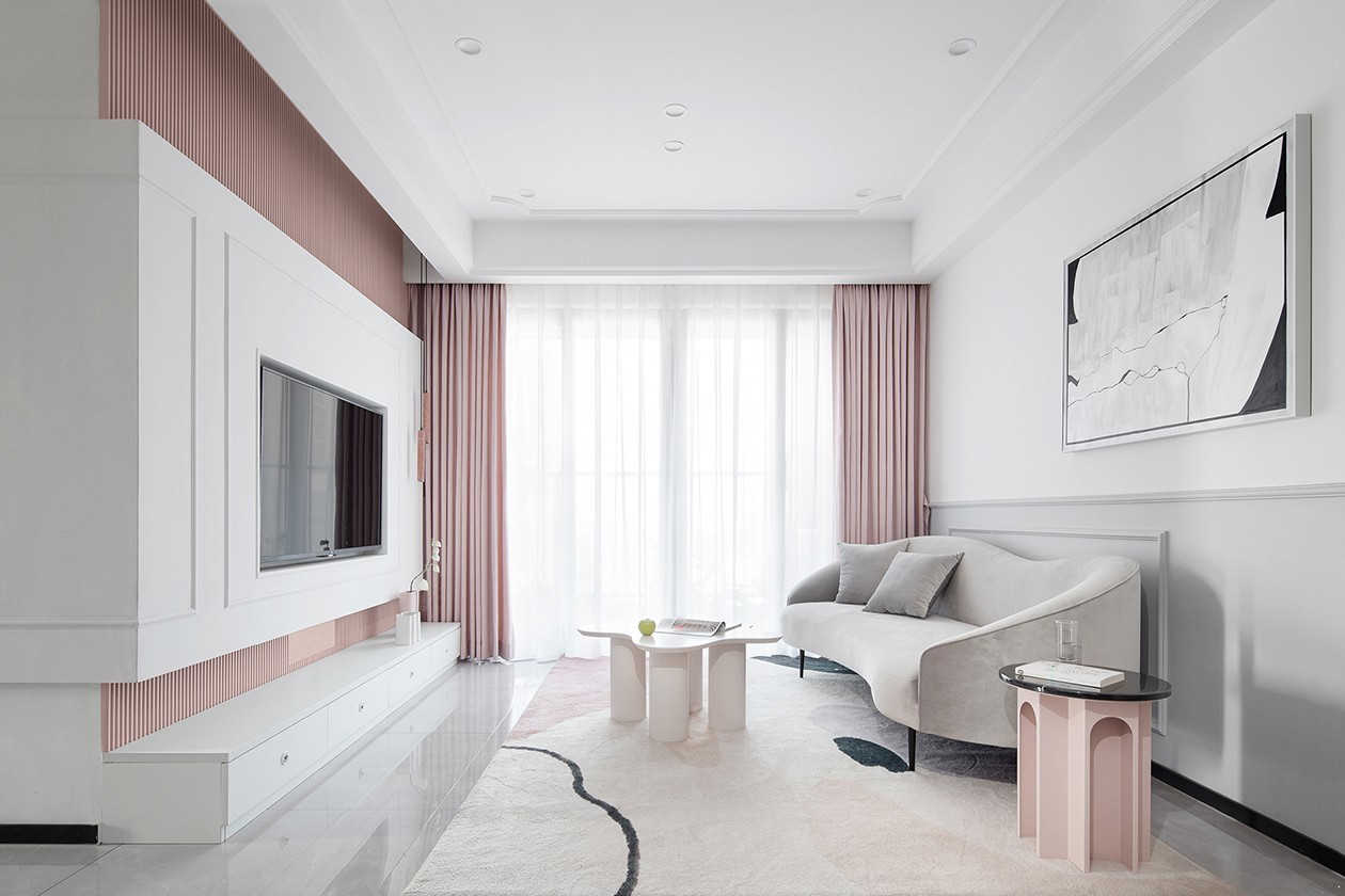 客厅电视墙采用几何线条与块面穿插的设计手法,以脏粉色格栅做衔接,结合白色相框型护墙板和白色电视柜,形成连而不断的视觉感。电视墙上下留空减轻视觉压抑感,电线设备等隐藏在电视机后方,打开内嵌灯带,点亮一室温柔。