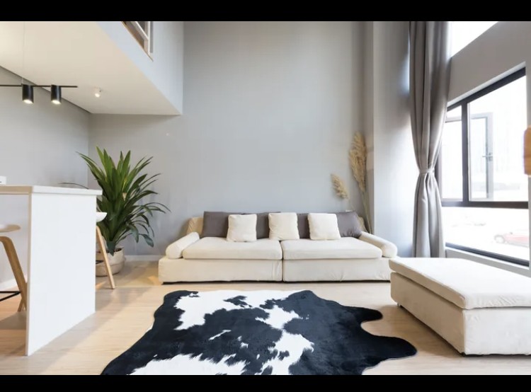 整体灰色调下搭配米白色的沙发及黑白牛皮沙发