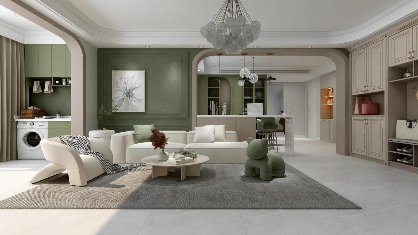 本方案为轻法式风格两房两厅设计,套内面积约90㎡。业主二人为了迎接幸福的新婚生活,将自己的小家整体翻新,期望能在一个充斥着优雅与浪漫的居所中和所爱之人共度余生。 设计整体将轻奢与法式风格相融合,以低饱和度的奶油色与橄榄绿为主基调,营造出温馨浪漫的居家氛围感;墙面多用线条勾勒,打造立体感,简洁而又大气,轻松演绎轻法式的优雅与浪漫,静诉时光的美好。