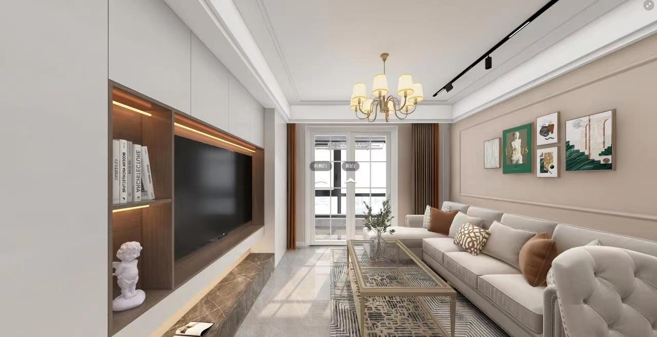 整体色系采用浅色系。采用主灯➕轨道灯形式,进行组合照明。电视柜采用满墙的形式,增加储物空间。