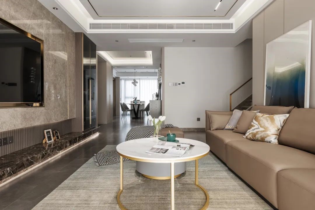 客厅棕色皮质沙发,结合大理石背景墙彰显高端大气