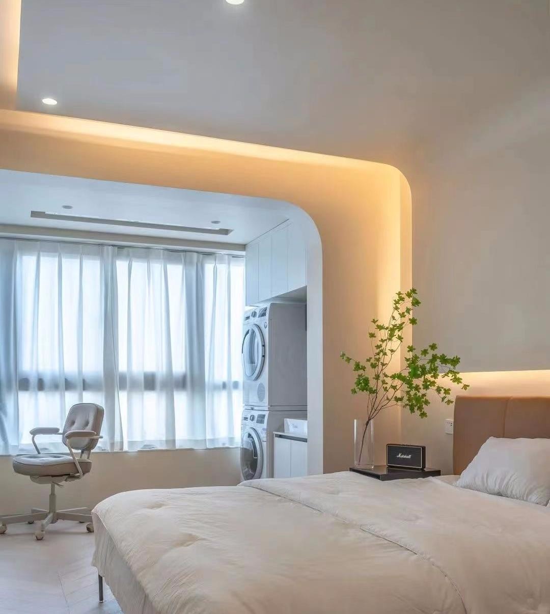 卧室区域我们设计了不同的灯光,去满足不同情景的使用,弧形的吊顶让业主躺在床上也有视野远眺的感觉。从上到下的灯光也拉长视野,让小户型也有大空间感。