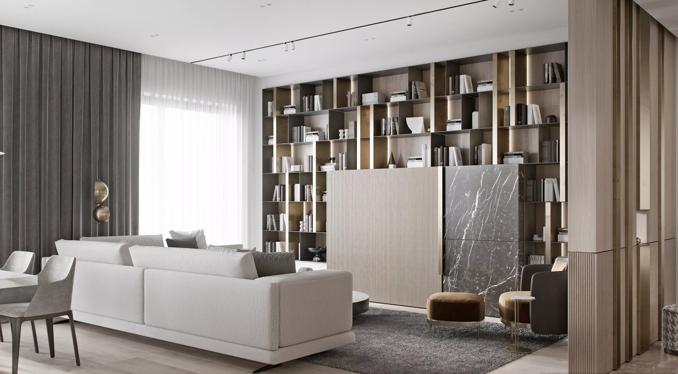 左边的水磨石和右边的木饰面很搭