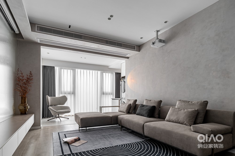 客厅空间利用不同深浅的白色与灰色进行铺陈,每个部分的颜色都自然过渡,让空间显得静谧而又温柔。