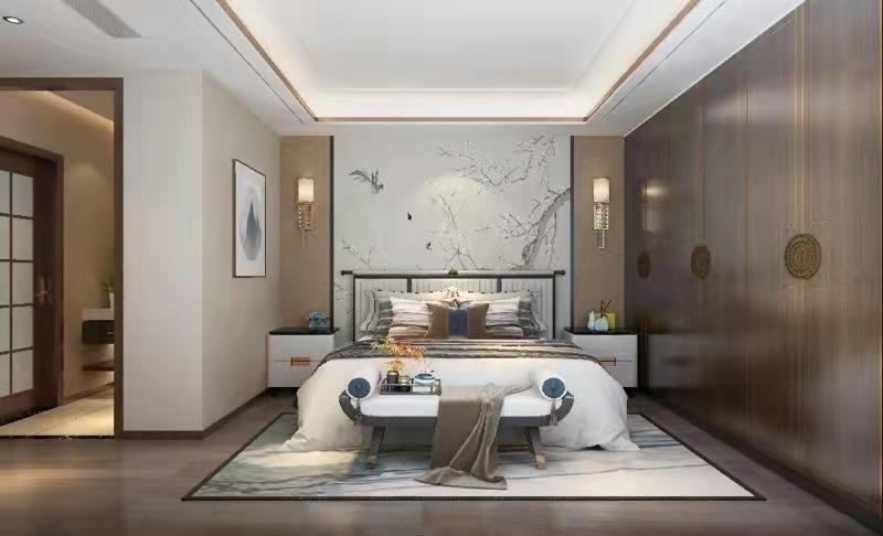 卧室空间采用无主灯设计,筒灯及灯带结合辅助光源作为主光源,床头背景墙“喜上眉(梅)梢”则增添了中式意境