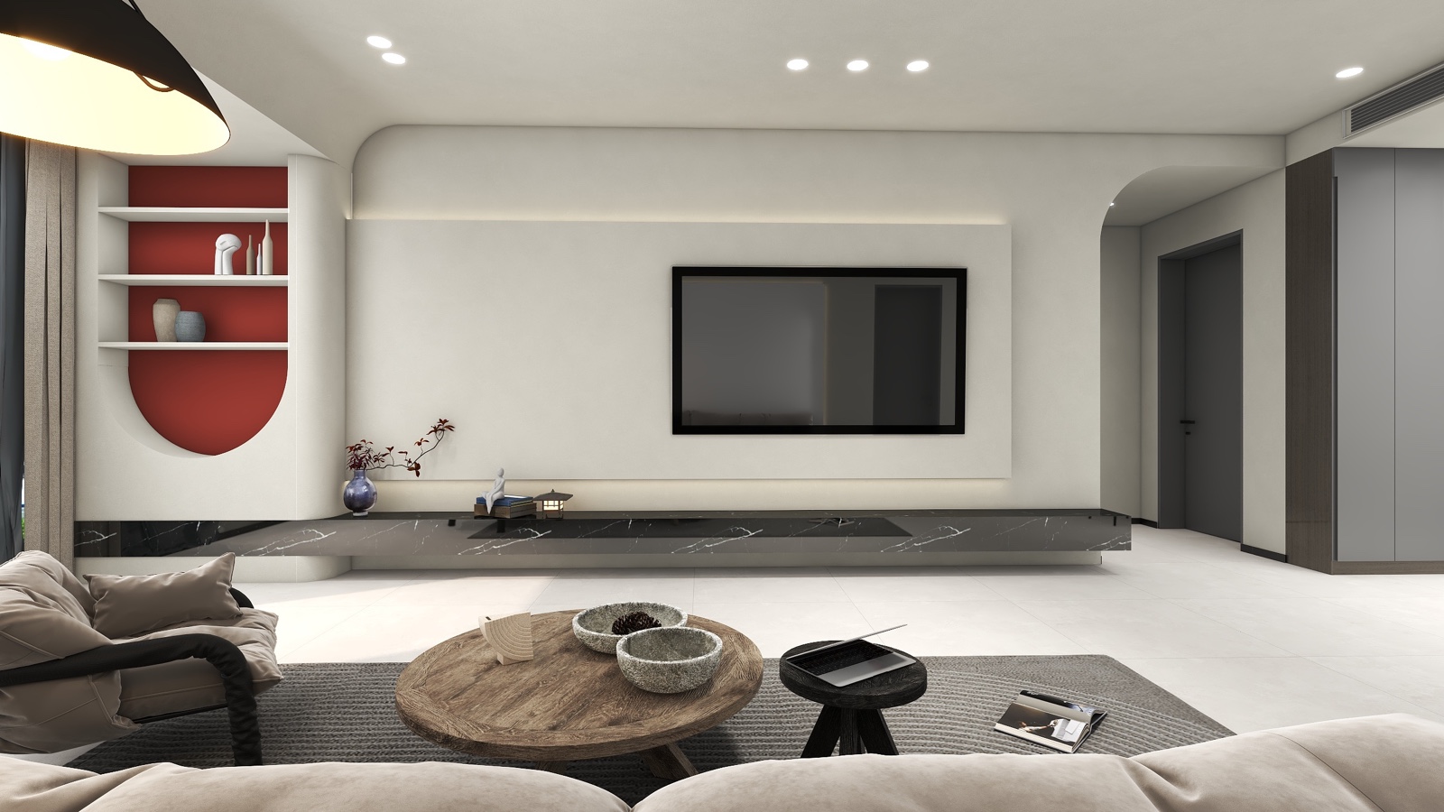 客厅以黑白灰三色为基调,搭配原木色家具,彰显其大气、沉稳的格调。凹凸的墙面加上红色点缀,层次感十足,个性鲜明。背景墙加上暗藏灯带点缀,氛围感十足