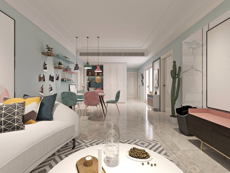 客厅背景墙统一采用淡蓝色的预调乳胶漆,搭配着莫兰迪色系的软装家具,突显北欧风格的特色,也让空间简洁、干净。