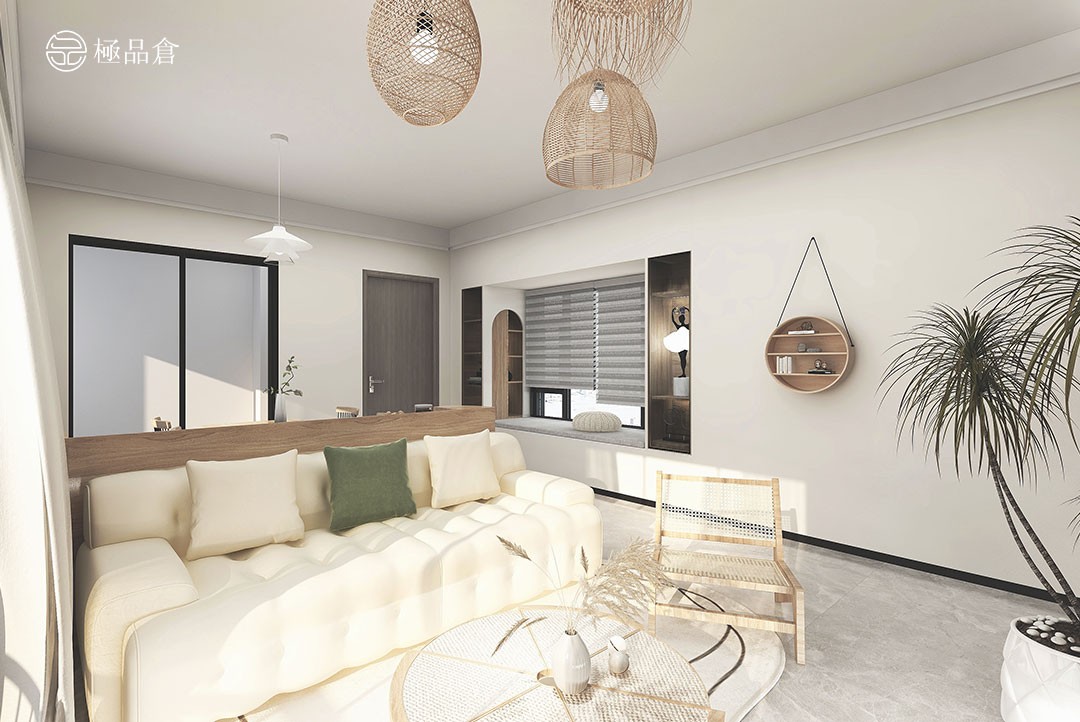 奶乎乎的乔雅沙发、超有夏天气息的藤编椅是客厅的一大亮点。温柔治愈,很惬意。