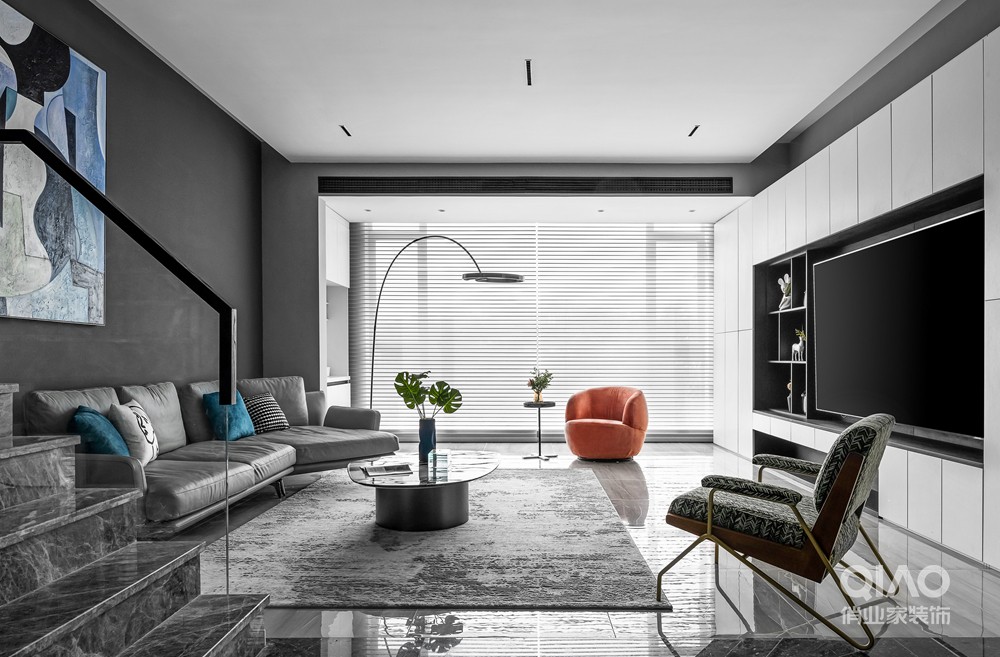 主卧用灰白的配色除却浮躁,利用比例、灯光、明暗变化营造空间氛围,温润质感的木地板,色彩对比强烈的橙蓝色双色窗帘,将艺术融入生活,有美梦也有人生。