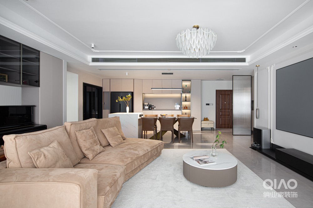 空间以不同深浅的杏灰色为基底,超长中央空调出风口细节满分,搭配高品质家具与鲜嫩的绿植做装饰,营造出纯粹、放松的生活氛围。
