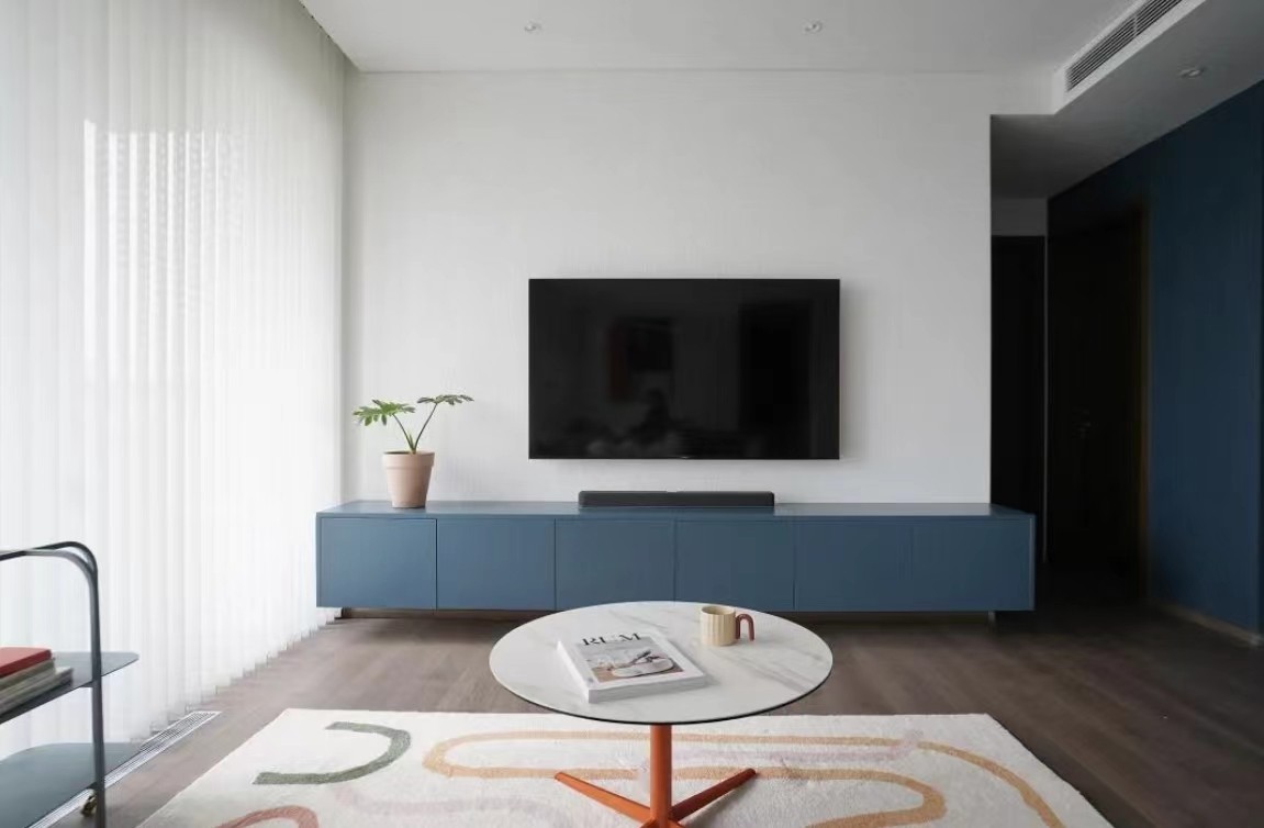 电视背景墙整体色彩有深有浅、层次分明。大白墙搭配壁挂式电视机,没有多余的装饰,简简单已是***的安排。柜门选用哑光烤漆材质,耐划耐蚀,抗老化性能好。悬空设计减少卫生死角,平时清洁也会方便许多。