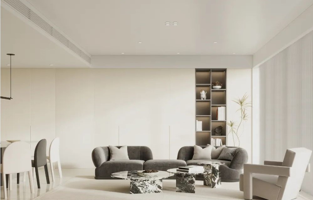 深色的沙发茶几压制住了纯白色空间过多的空灵感, 多了几份沉稳和个性,奢石的点缀增强大平层的空间质感。