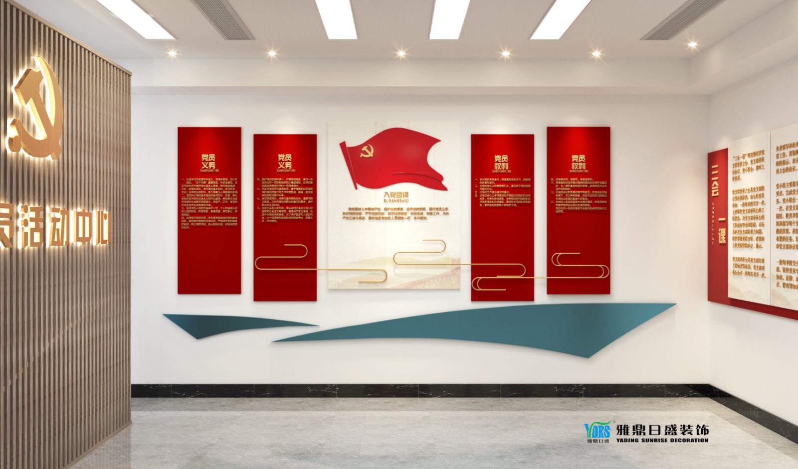 宣传墙主要为红色调为主,搭配入党誓词,拥有的权利、要履行的义务等详细条例,简洁有力的达到了宣传目的。
