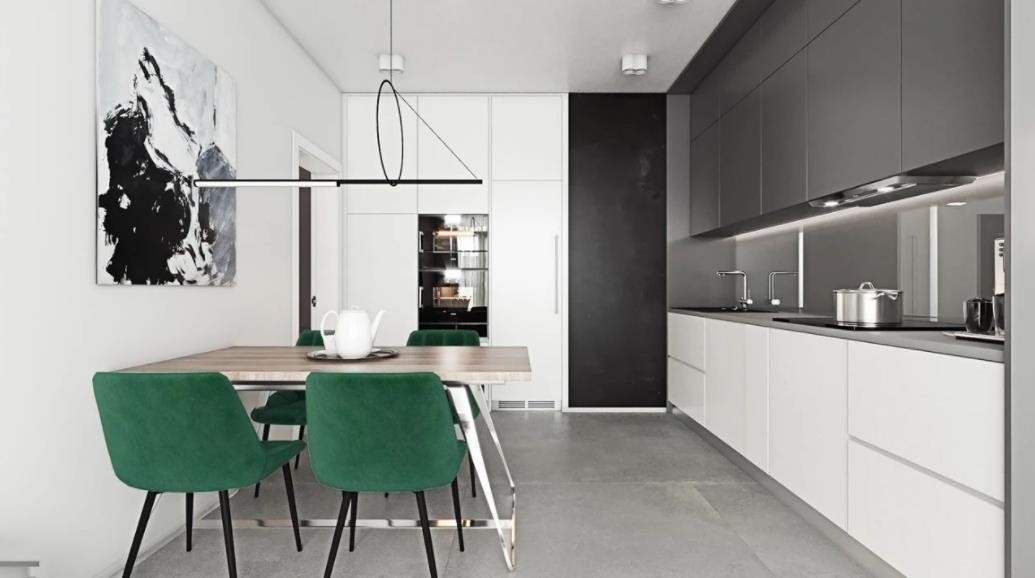开放式厨房是为了扩大空间,黑与白的搭配是为了保持平衡性,绿色为了点缀空间