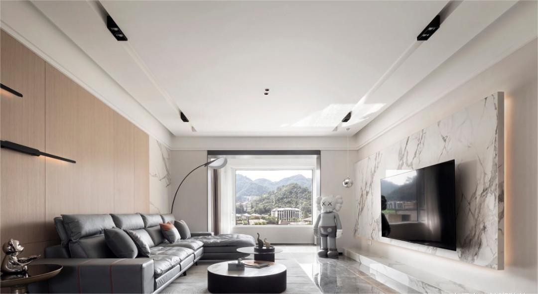 夜晚璀璨的水晶灯折射出晶莹剔透的光影,犹如散落下的星河,温馨浪漫顿时在客厅空间蔓延。