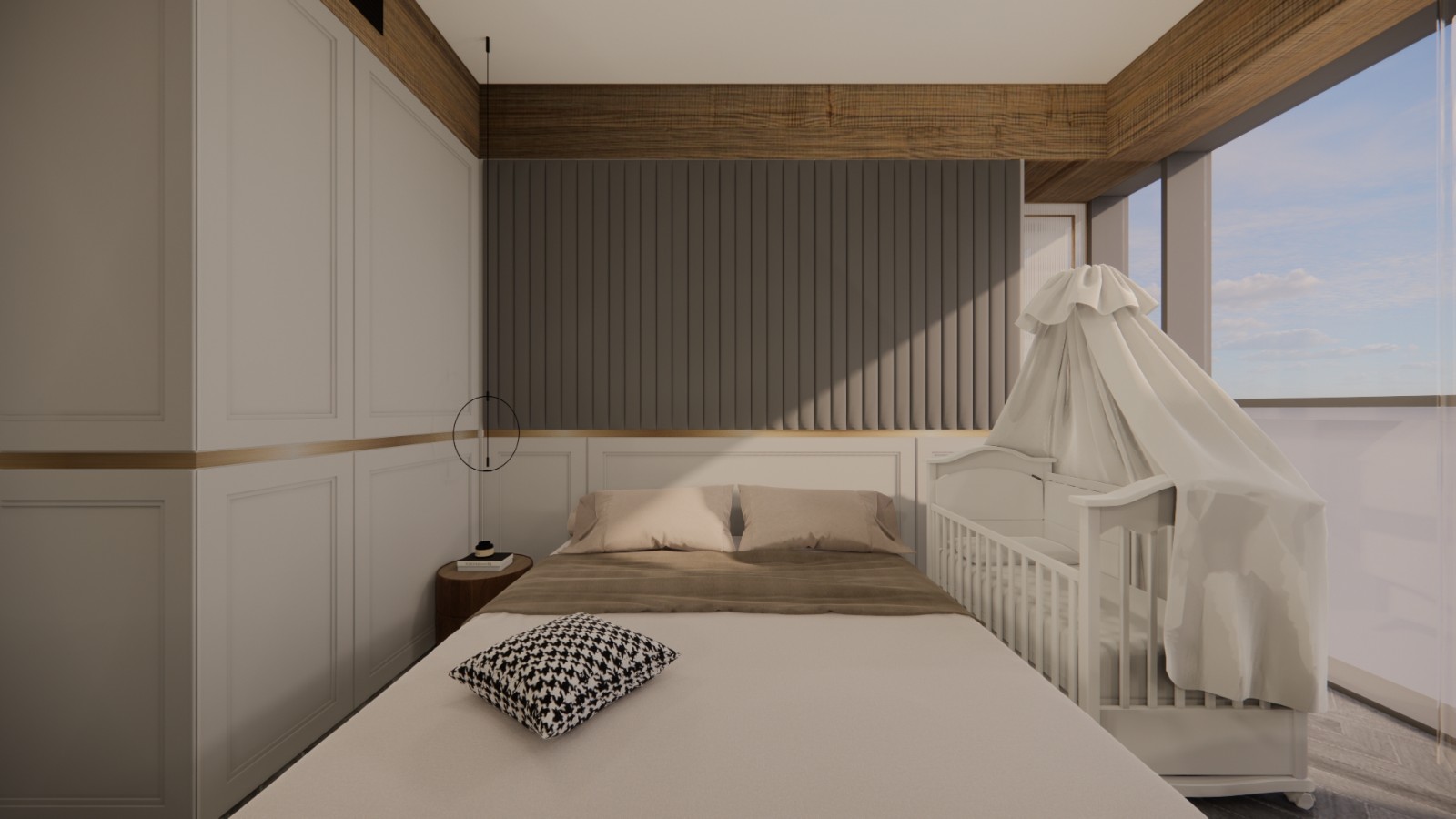 客厅墙面采用大面积黑胡桃饰面板 顶面满吊顶 彰显空间感