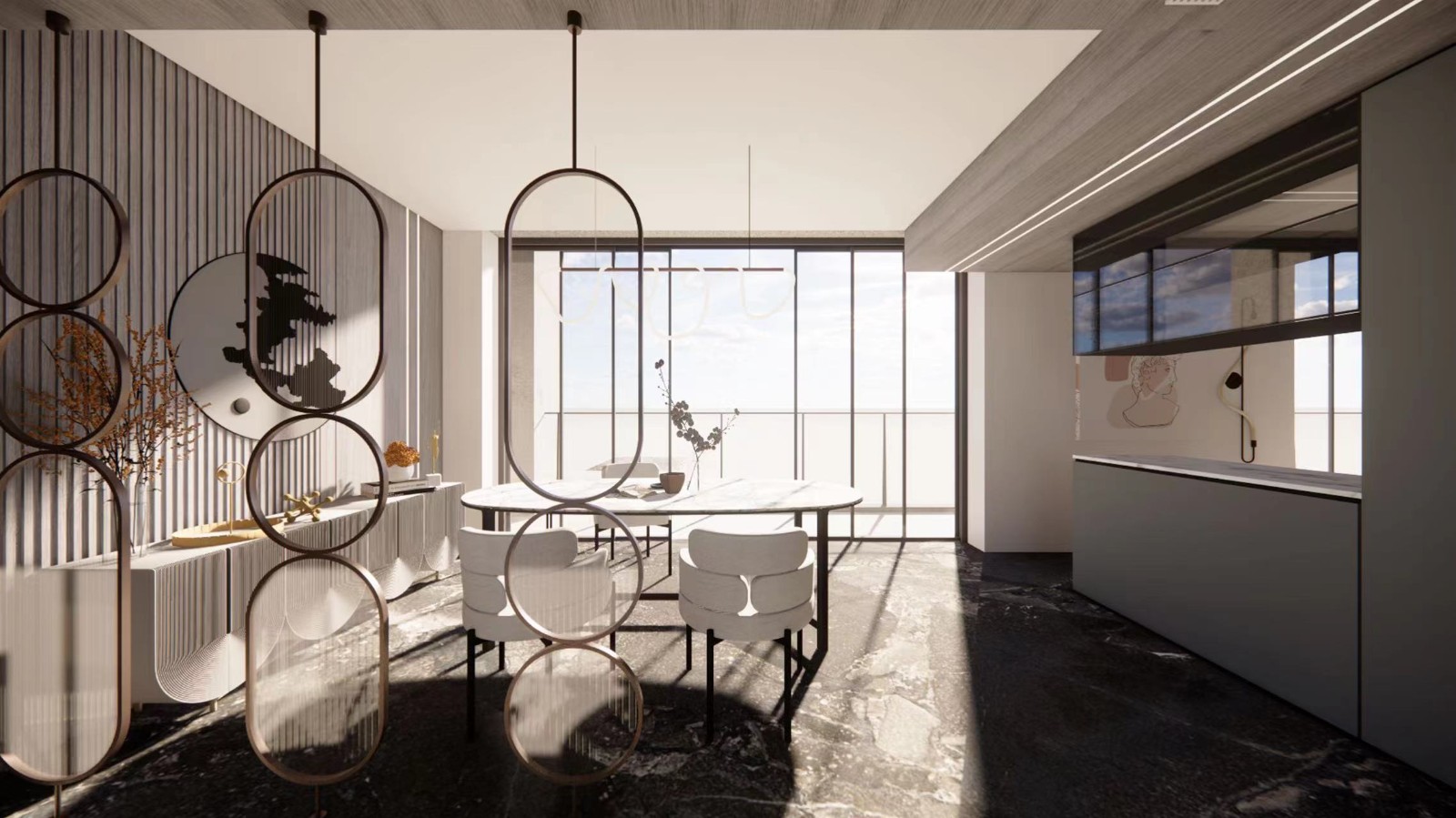 餐厅顶部采用木饰面 配合墙面木饰面效果 地面大面积岩板