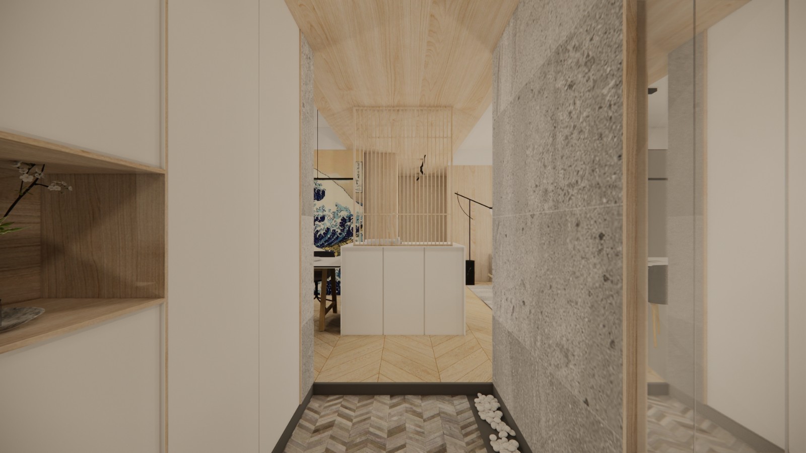 岛台搭配玄关,后背景神奈川冲浪里的定制移门,日式设计氛围直接被烘托出来,顶部吊顶玄关等宽的木饰面吊顶一路到底,里面正好藏住中央空调内机,美观而有仪式感。