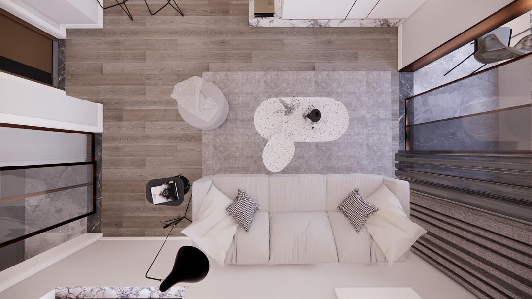 客厅3+1的搭配设计,沙发选择浅色布艺,搭配水磨石材质的组合边几,整体色调明亮,生活气息足。
