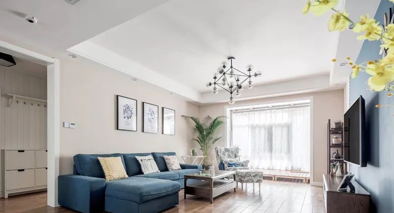 改造后的南阳台与客厅融为一体,抬高的地***立又休闲,沙发和背景墙大面积的蓝色,使空间温馨有新意。