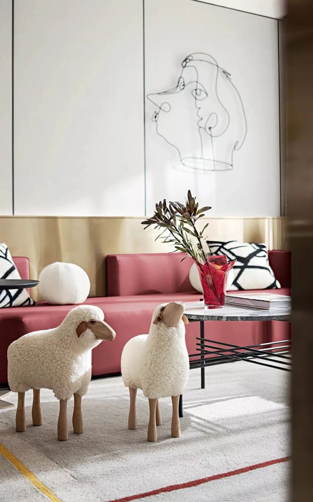 沙发墙以金属质感的墙脚+硬包材质的墙身组合,挂上一盏壁灯、金属线条装饰,布置玫红色皮沙发,搭配圆形的石材茶几,毛绒的小座椅,让空间显得格外的时尚优雅而精致。