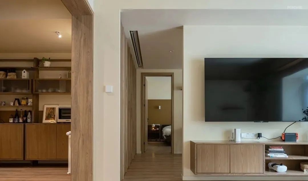 客厅悬空的电视柜增加了空间的轻盈感的同时也是给宠物提供一个跳高路线,可以从电视柜跳去飘窗,飘窗跳去茶几,茶几跳去猫爬架,像这样的路线在本案中还有很多条。