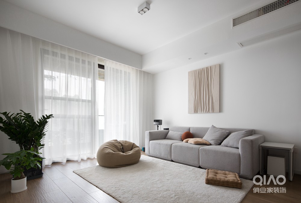 自由组合的沙发套件所带来的低饱和莫兰迪色点缀空间,给整个客厅带来一种被包裹的柔软质感。