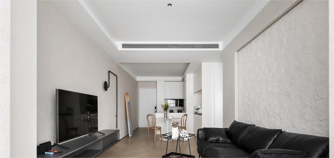 沙发背景墙做出了内凹造型,中间由艺术漆作为「质感担当」,粗粝的纹理减少空间的单调。 艺术漆背景墙与「边框」之间的夹层中安装有灯带,微光亮起,营造出强烈凹凸层次感。