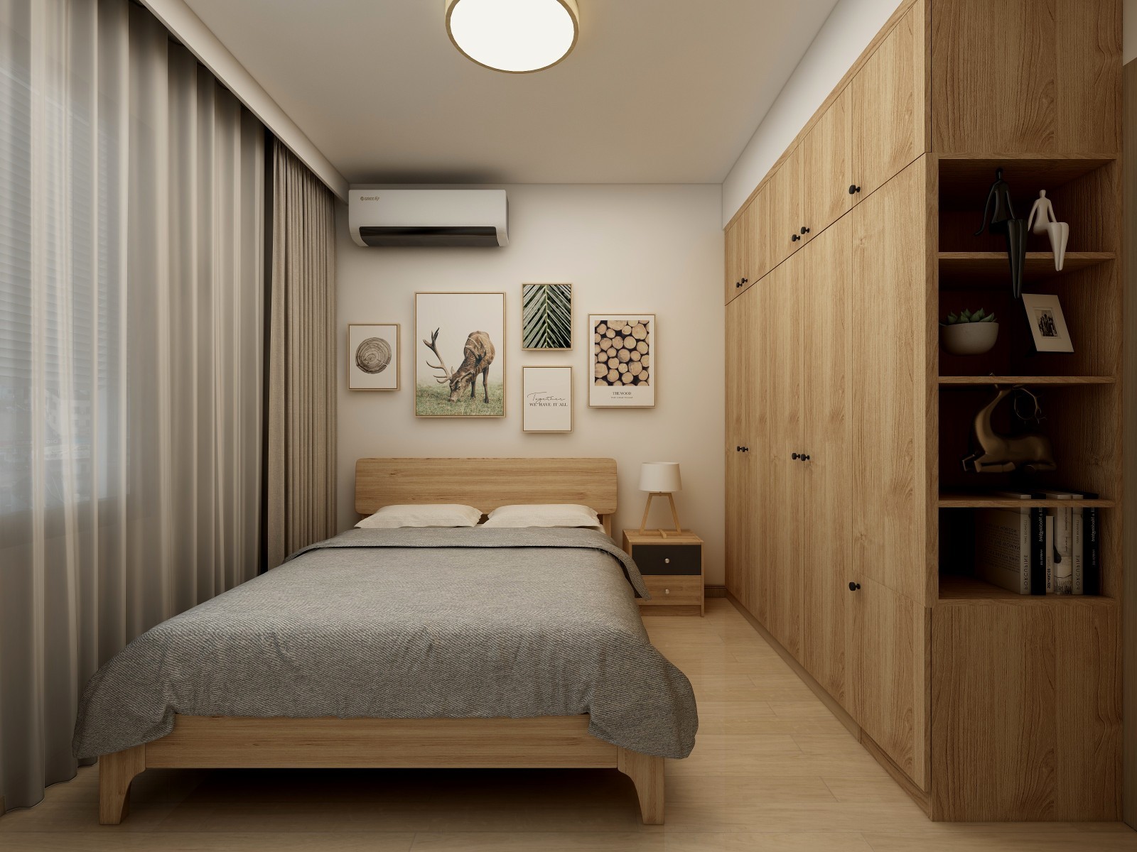 主卧室进门后,右侧做开放格,让进门的视觉不会封死,整体空间采用原木色近色搭配