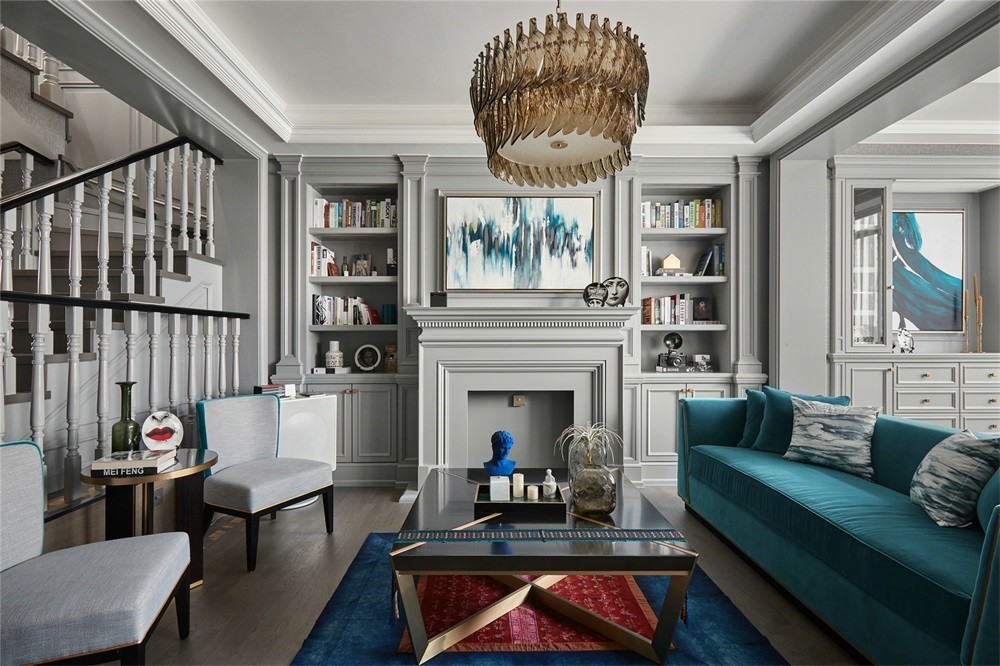 走入客厅,被整面背景墙震撼到了。精致的美式护墙,让壁炉与书柜完美的结合,灰色又让木质更赋现代时尚元素,稳重而大气