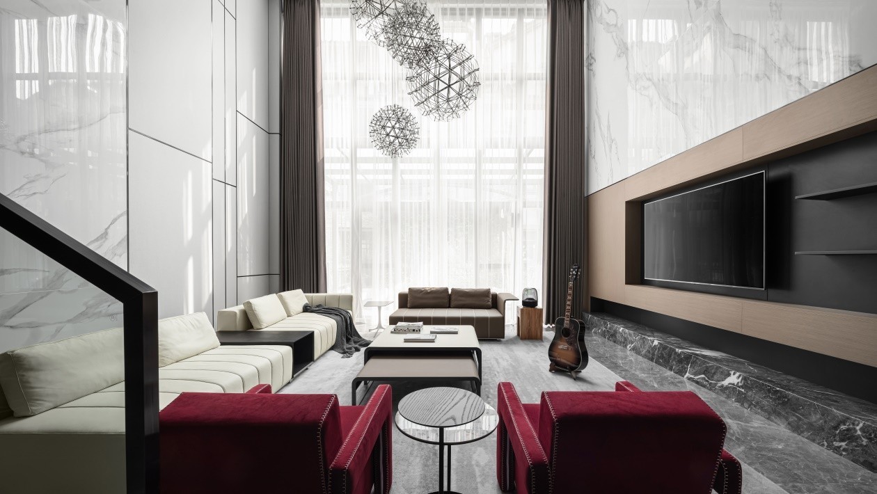 本案的在平面阶段,我们对户型的采光重新梳理,光线进入的面积较大。为保证人在空间当中的舒适性,在材料选择的时候大部分选择的是哑面材质。保证在充足的光线进来的同时不会产生光线无秩序的折射。